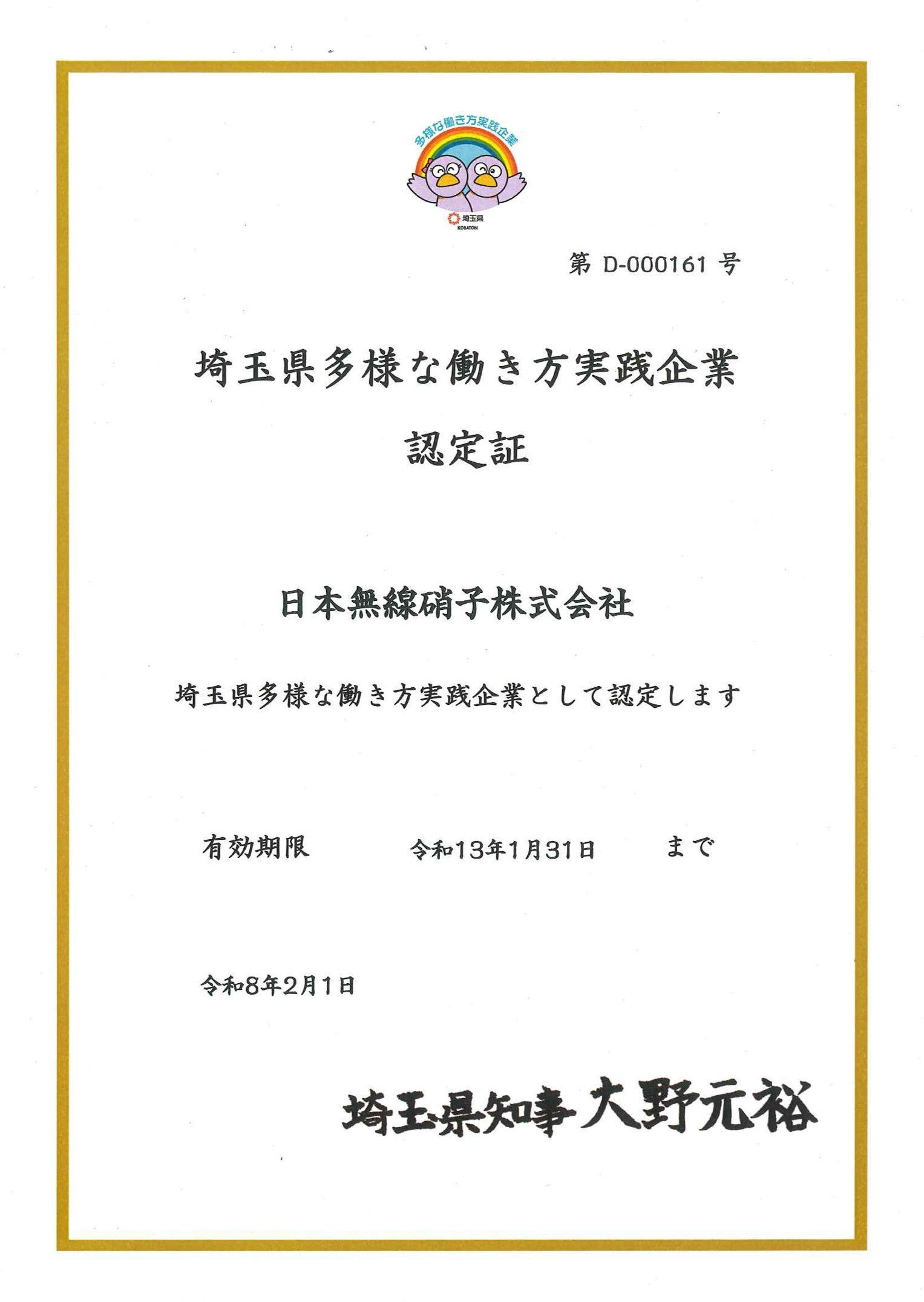 日本無線硝子株式会社は、令和7年度の「多様な働き方実践企業」として埼玉県より認定を頂きました。 この制度は、仕事と生活の両立を支援するため、多様で柔軟な働き方を実践している企業等を埼玉県が認定するものです。 育児・介護休業取得の実績や、女性や高齢の従業員など誰もが活躍できる環境など、当社の働きやすさが評価されました。